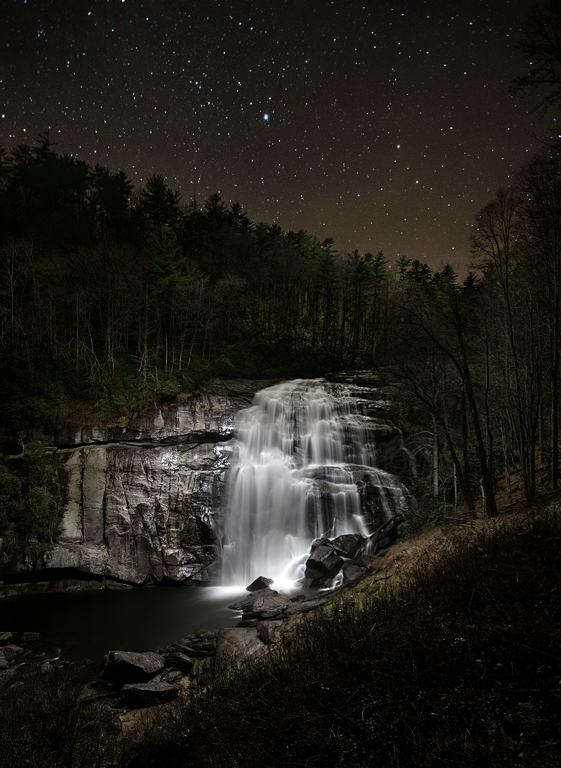 During a family trip through the stunning landscapes of North Carolina, we discovered this breathtaking waterfall while hiking with friends. As an artist and photographer inspired by the natural beauty of the region, I always carry my gear, ready for the perfect moment. With only one night to capture this scene before our departure, I faced a challenge: hiking an hour in complete darkness to the falls, setting up my equipment under the starry North Carolina sky, and hiking back before sunrise.