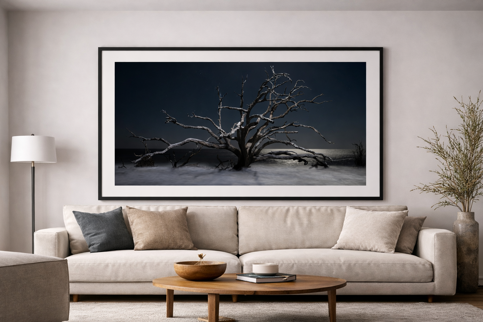 On Driftwood Beach, a fallen giant stretches across stone and tide, suspended between ocean and sky. The full moon rises low on the horizon, burning through the darkness as stars scatter above like distant witnesses.